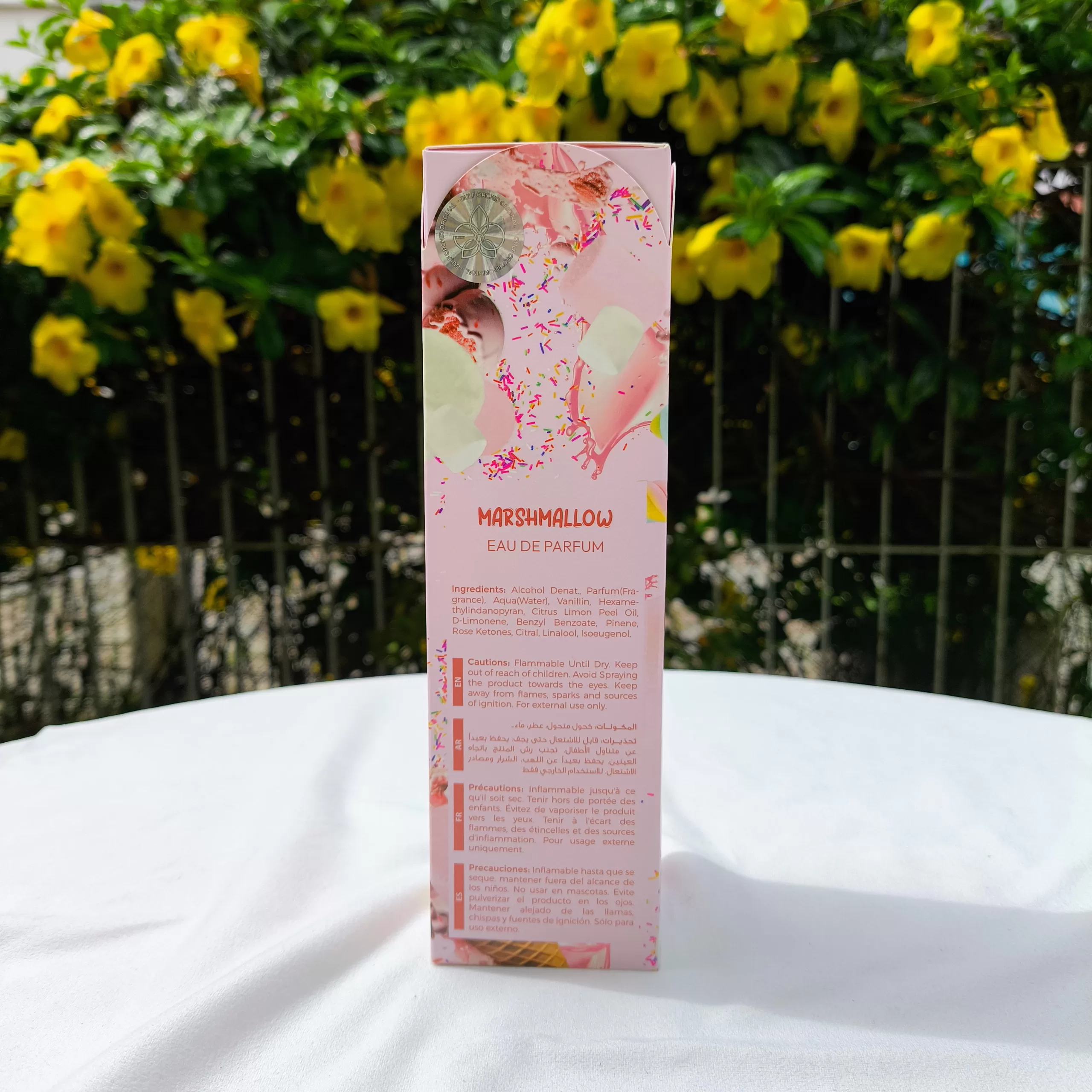 A fragrância abre com a explosão irresistível e açucarada do marshmallow, que logo se entrelaça a um coração floral delicado de néroli e jasmim, trazendo sofisticação à composição. No fundo, a baunilha cremosa, o caramelo e o almíscar garantem uma fixação duradoura, deixando um rastro atalcado e absolutamente viciante na pele.